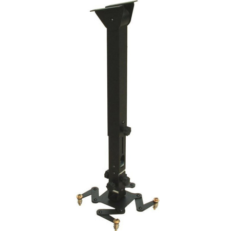 Professional universal telescopic (57-90 cm), ceiling mount for video projector. Adjustable mounting flange angle +/-90°. Adjustable fine tuning of the axes by four knobs, without any tool (Patent n. 1359423). Cable and connectors can run inside the tube. Ehnanced thickness of the structure suitable also for bigger video projectors. Optional extensions.