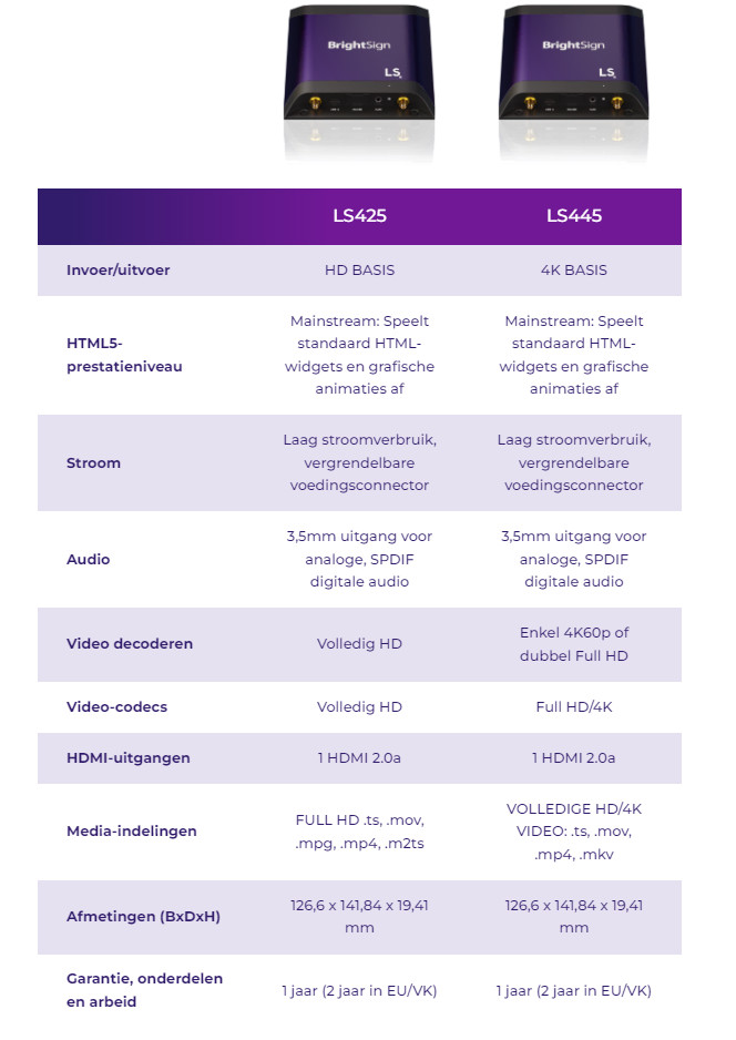 Maak kennis met de gloednieuwe BrightSign HD5, een player die ervaringen buiten het scherm mogelijk maakt. Dit ultramoderne apparaat is speciaal ontworpen om interactiviteit, 4K60p HDR10-video en veeleisende HTML5-animaties te ondersteunen. De veelzijdige I/O-set vergemakkelijkt de installatie en bediening van interactieve randapparatuur zoals aanraakschermen, nabijheidssensoren en knoppen. Daarnaast ondersteunt het UDP- en seriële commando's voor het beheer van omgevingselementen zoals verlichting en routing in vergaderruimten. Geïntegreerde partneroplossingen bieden netwerken van players die gegevens over publieksmeting, monetisatie en analyse kunnen leveren aan een gecentraliseerd dashboard. De gepatenteerde aluminium behuizing en slanke vorm van het apparaat garanderen een betrouwbare werking, zelfs onder zware omstandigheden. Met zijn volledige reeks I/O-aansluitingen, superieure 4K-videokwaliteit en geavanceerde HTML-prestaties is de BrightSign HD5 de ideale keuze voor boeiende ervaringen die uw publiek boeien.